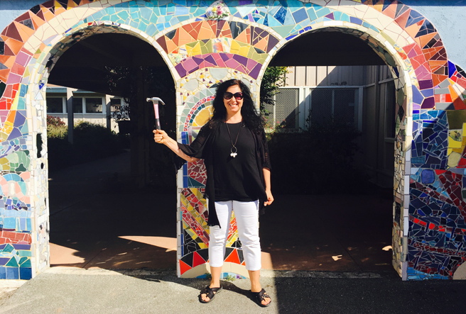Irene Carvajal (Belmont, California) with her (what) do YOU think? desk with the positive messages we’d wish we’d grown up with carved into the wood. You can even take rubbings with the graphite pencils and paper provided, if there is a resonating message you’d like to bring home with you.