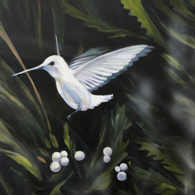 It’s so magical to see a ghostly white apparition in the forrest! I was overwhelmed the first time I saw an albino deer years ago at Pine Mountain Lake in Groveland and thrilled to witness a leucistic hummingbird at the UC Santa Cruz Arboretum a year ago! I am intrigued by the increasingly frequent reports of albinism and leucism in our native flora and fauna. Very rare in the wild, these white creatures stand out from their surroundings making it hard for them to be a predator and harder still to be prey. These genetic conditions carry other risks as well, including sensitivity to sunlight with a higher risk of skin cancer and weakened feathers in birds. Finding mates can also be more challenging. Plants without the chlorophyl fail to thrive and need to be associated with a green parent plant to grow. Interestingly, the case of albino redwoods, there is evidence that the albino shoots are actually processing toxins in the soil. With the expansion of human development, real wild spaces are shrinking and becoming disconnected, creating isolated gene pools which heighten the opportunities for recessive albinism and leucism to express where it might not in a more diverse gene pool. Animals like deer, squirrels and raccoons that can live close to humans benefit from increased predator protection and entire communities of leucistic and albino populations are popping up. Of course there are more people and cameras on the look out for these unique and beautiful creatures. In this series I have laid an encaustic veil over the oil painting of flora and fauna, at times inscribing lines of pigment, colors which has been lost. I see this veil as one that we are unintentionally drawing over our wildlife.
