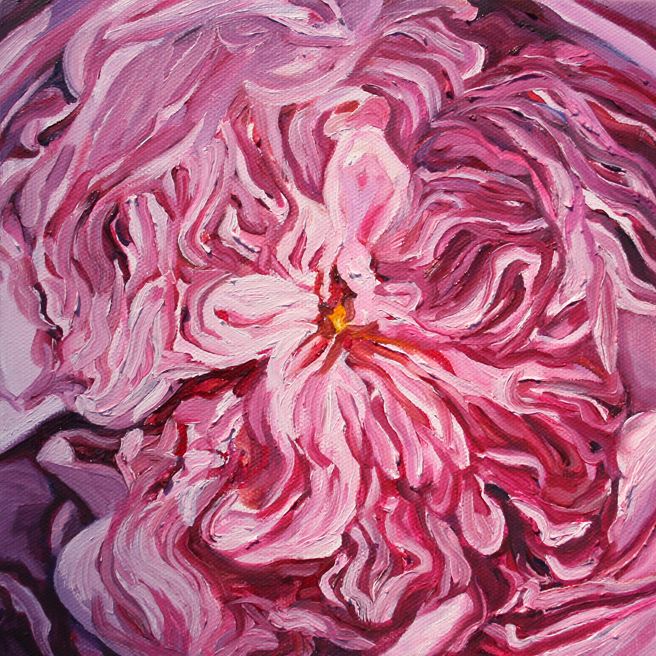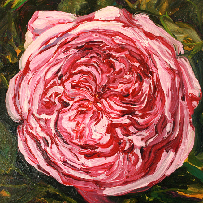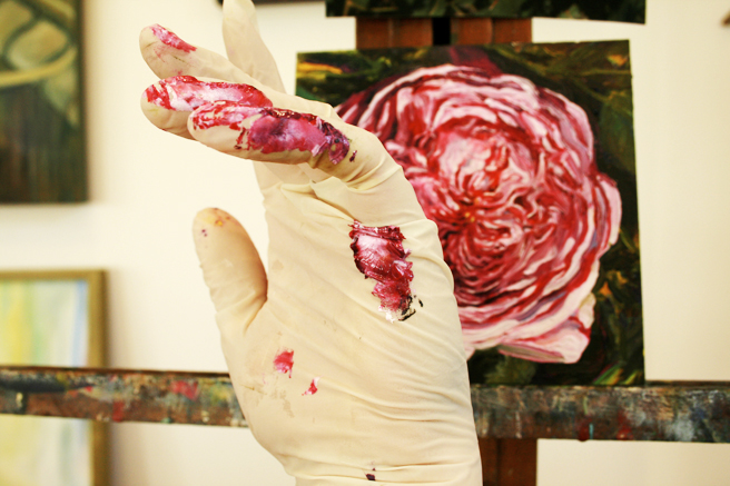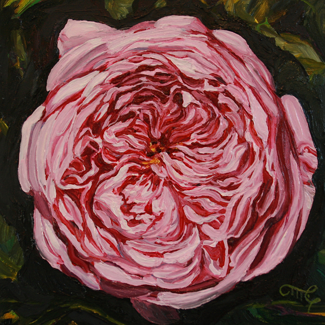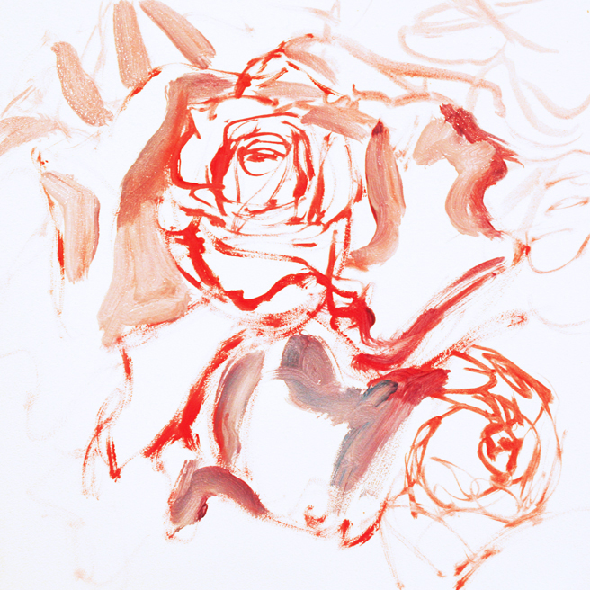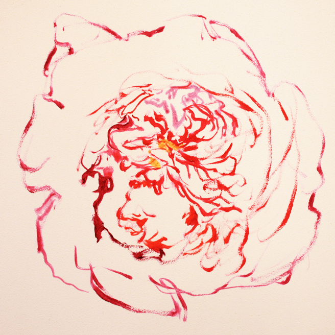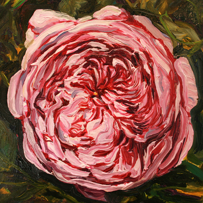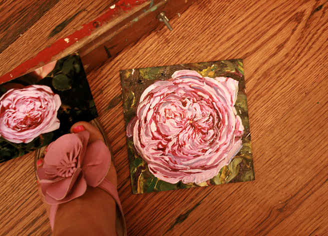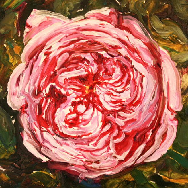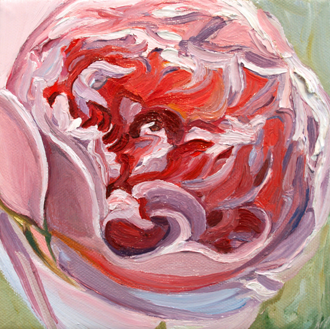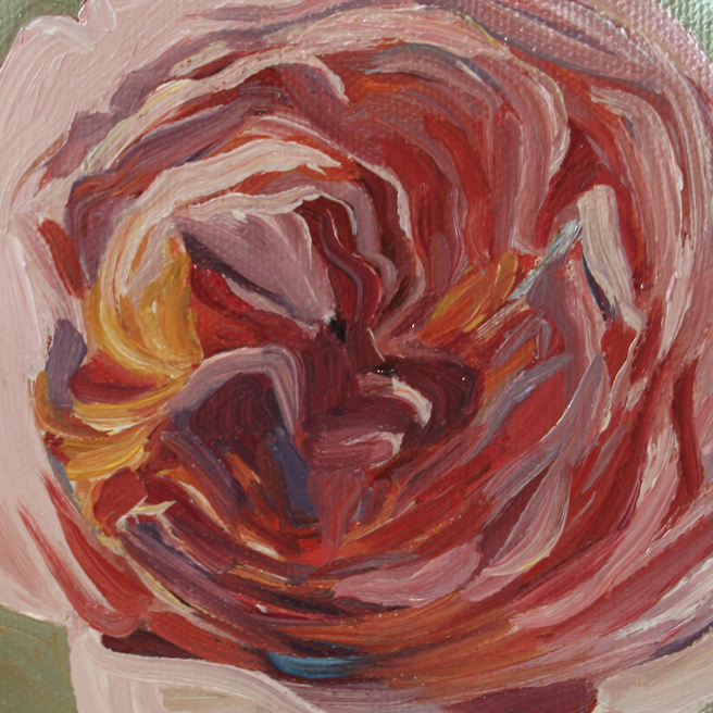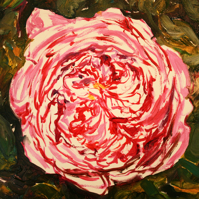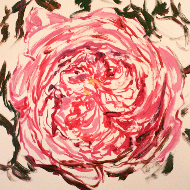 I painted out a loose gestural outline of the rose on a prepared pink ground.