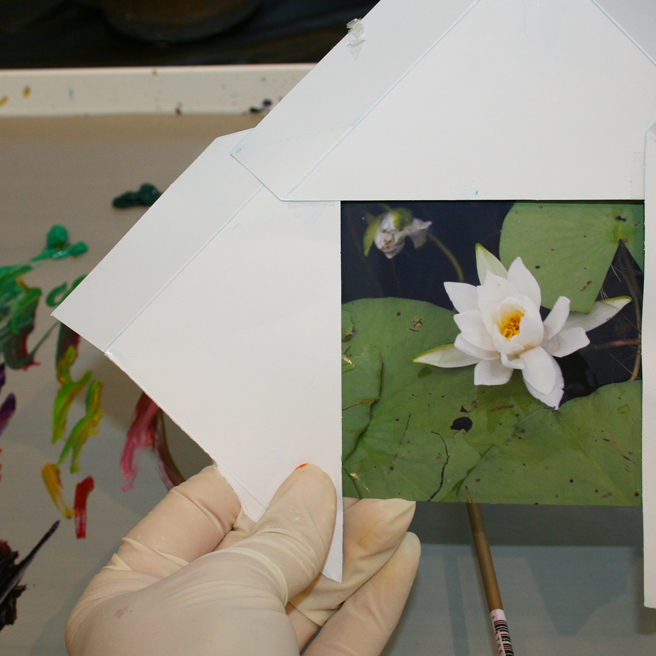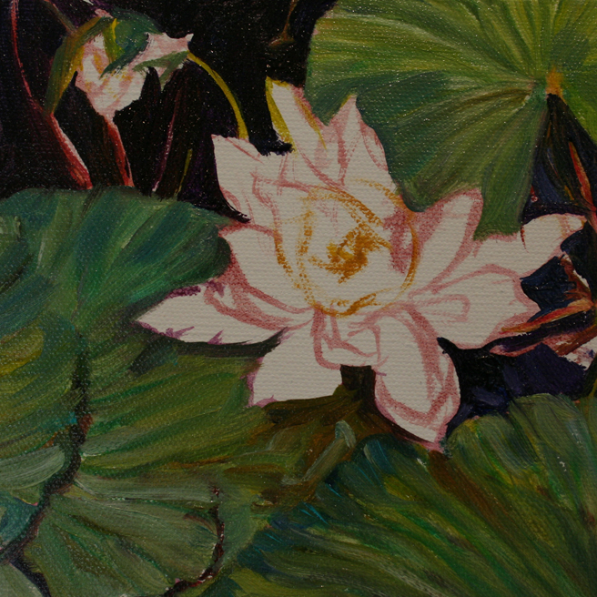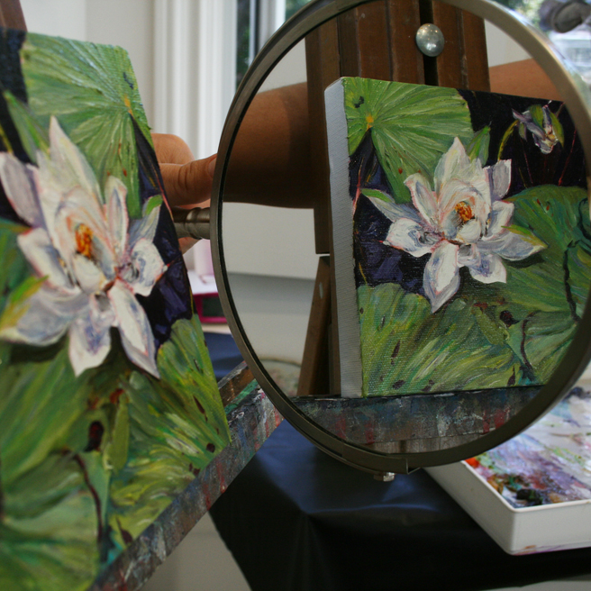 Here are photos from different stages of the painting of Desert Lake Pond Lily I, including several easy methods to check the progress of a work: