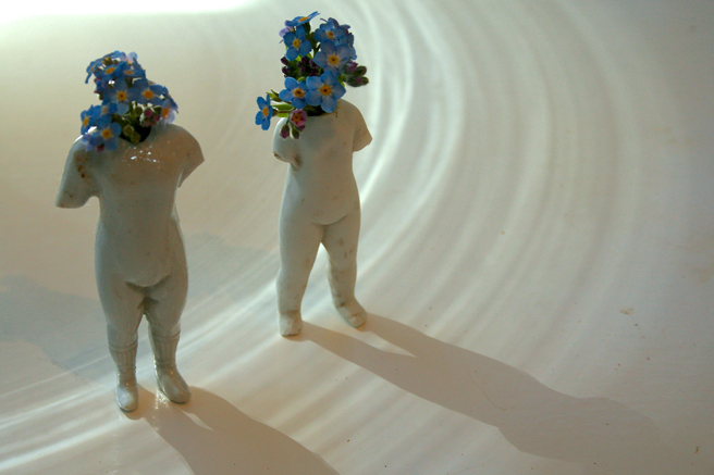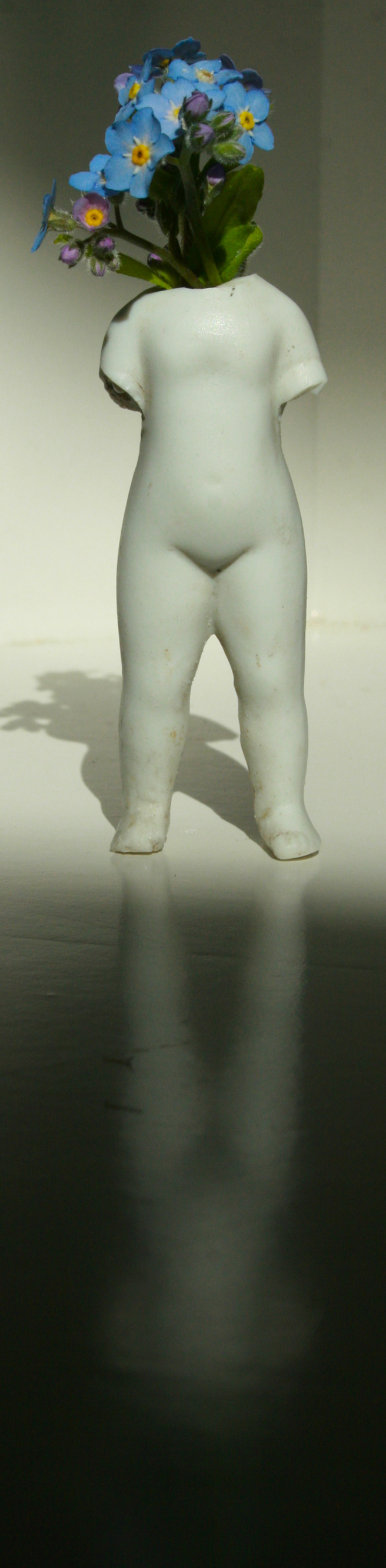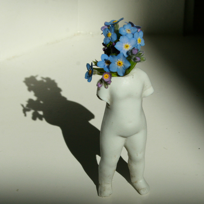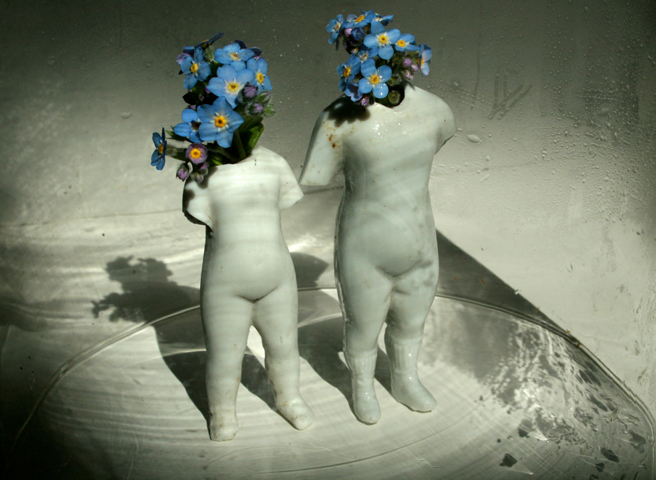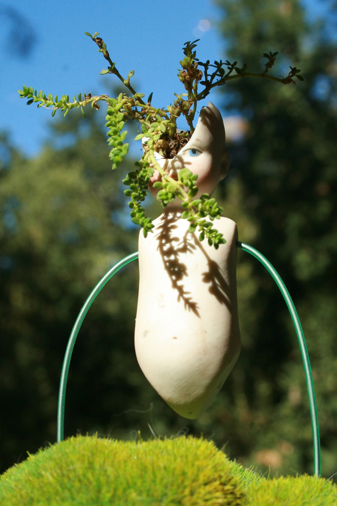 I hope these little constructions don’t come across as too creepy. I feel it’s rather appropriate to use these figures in conjunction with earth and plants and flowers, referring to the history of these broken or imperfect dolls that were long buried because of their defects are at long last seeing the light and being played with.