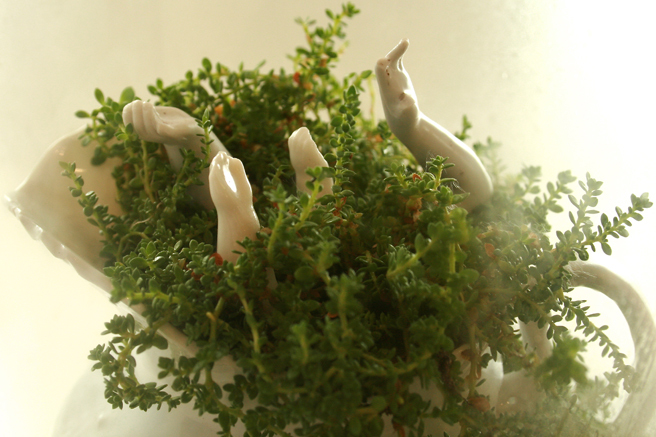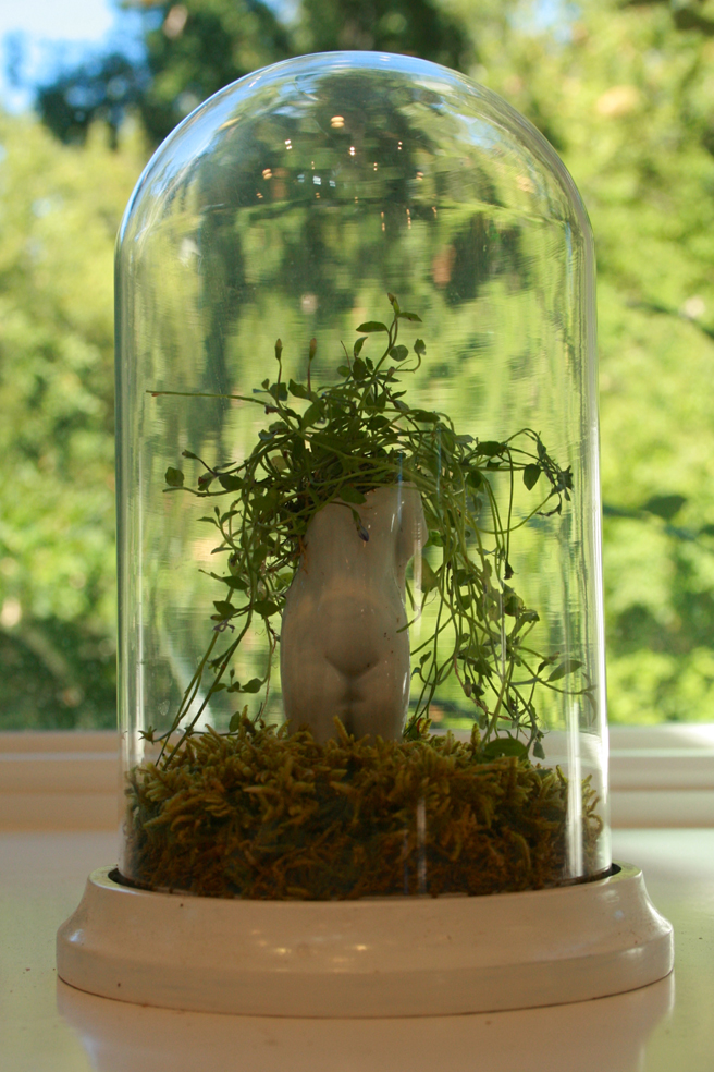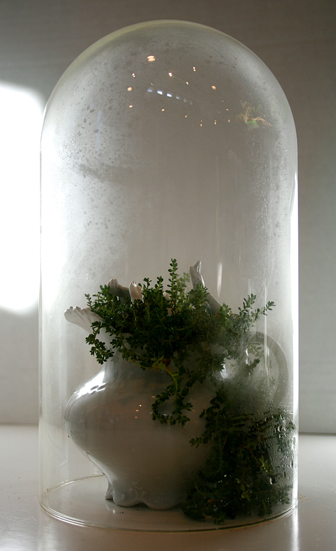 I love the idea of terrariums, miniature gardens under glass that can be so magical and whimsical, like little worlds unto themselves. On the weekend I was messing around with materials that I had lying about the studio, bits of broken pottery too full of potential to throw away, parts of antique porcelain dolls that had been unearthed from the reject dumps of the doll factories of Thuringia, Germany (c.1850 – 1920) and bits of ground cover and flowers from my garden. Here’s what I came up with, though some of them are really vases or planters.