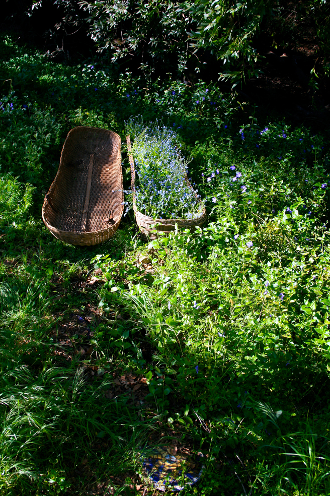 I so love this project! Conceived as the first of many installation pieces to compliment my Florilegia series, this casket full of forget-me-nots combines my love of gardening, antiques and art. Rooted in of the Victorian language of flowers where the message of the forget-me-not is, not surprisingly, “remember me”. This early wicker casket is as much a basket as it is a coffin. I love the underlying sentiment of this piece, the unending desire to be loved, to be remembered.