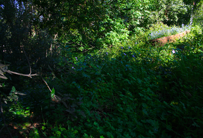 Anyway, It’s been the elephant in the middle of my studio all year storing odds and ends waiting for the forget-me-nots to come into bloom. And now that they have my desire as a gardener to see my garden thrive has been in conflict with my drive as an artist to see vision realized while the weather has been ignoring both sides of me. But I did it! I got out my shovel and my boots and I lugged everything into the ravine behind my studio, all in the name of art. And why do all of this? There is such satisfaction in seeing an idea through, past the cluttered and private recesses of the mind and into the world where it can be shared in such a real and tangible way.
