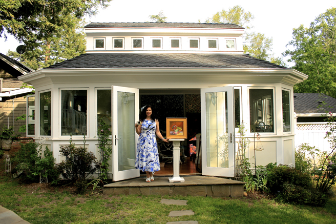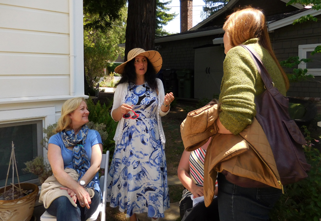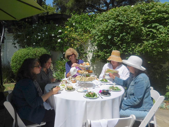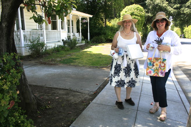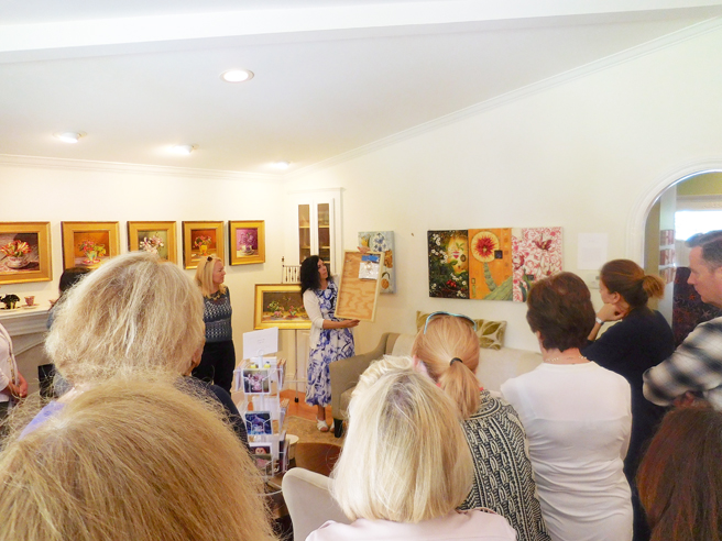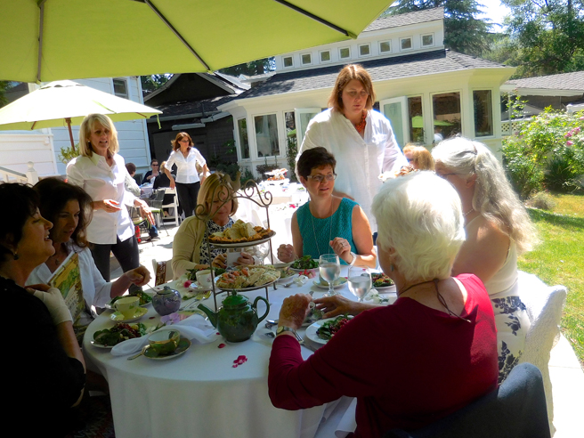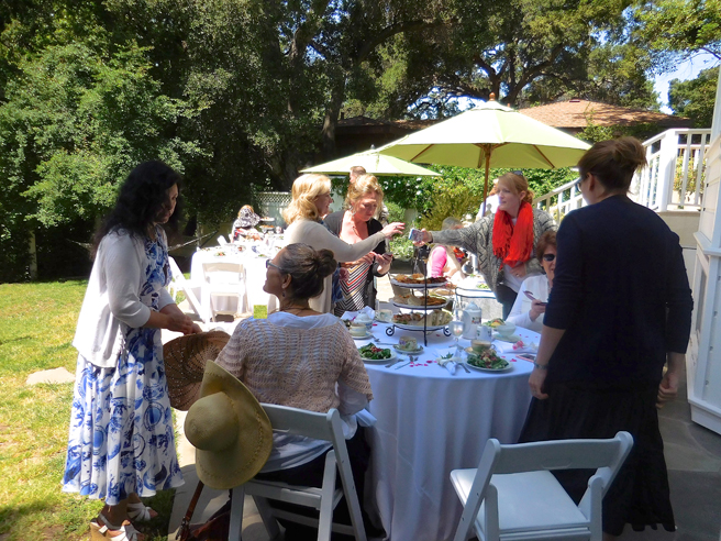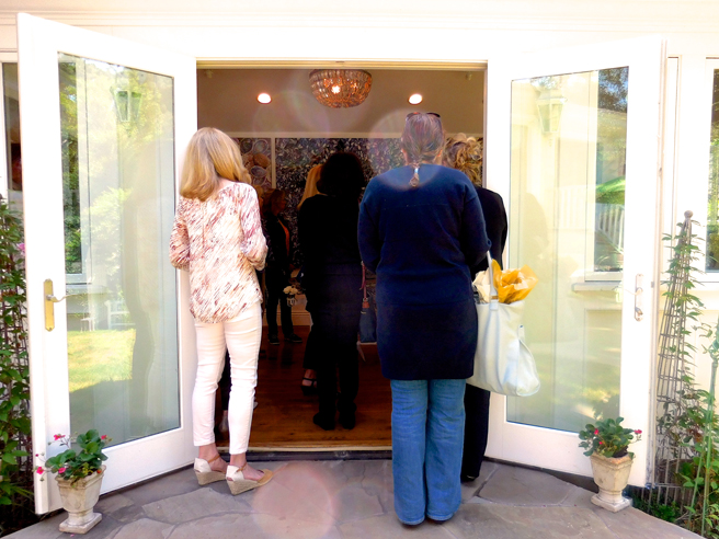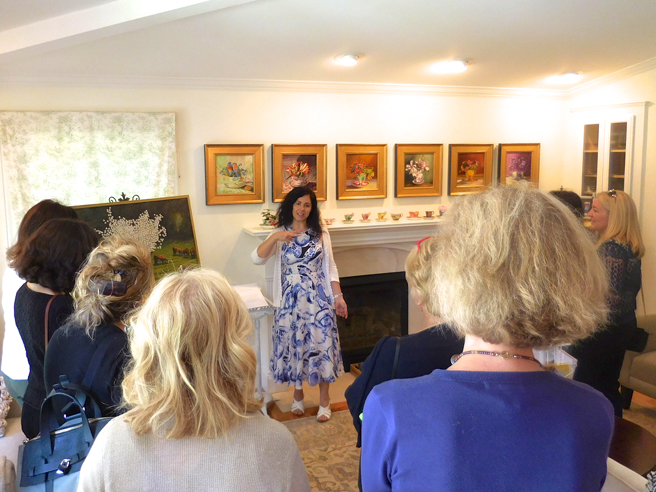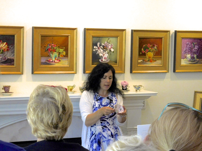 The Art Docents of Los Gatos hosted a fabulous High Tea fundraiser at my home and studio yesterday. This dynamic group (that brings art to our public school) keep themselves well informed by taking in all kinds of exhibitions, documentaries and artist talks. I was absolutely delighted when they approached me with the idea of throwing a catered High Tea here, using the very antique teacups that I use in my Birds and Teacup paintings. The idea was brilliant and I jumped at the opportunity to share my work with such an informed audience! Such a nice way to support this organization which does really valuable work with our children.