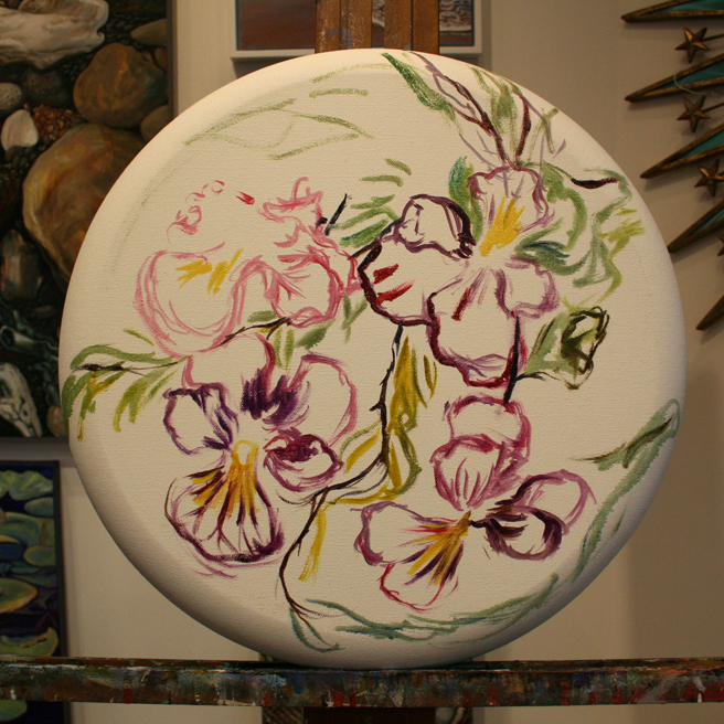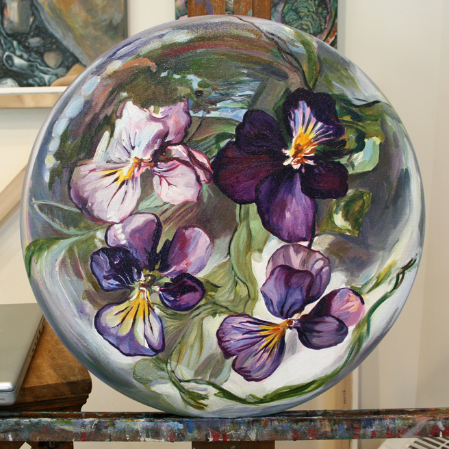 I have lots of must dos and should dos on my agenda. Too many musts and shoulds can stifle creativity and I really needed to do something just on a whim. On Friday I took out a convex canvas I had kicking about the studio and knew it would be a great match for the heartsease paperweight I had photographed earlier this fall (sometimes you don’t even know you want to paint something until you photograph it). Here’s how it’s coming along.