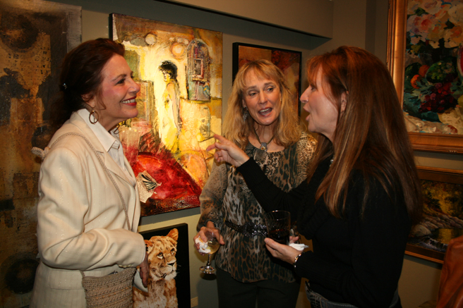 Member artists Mary Ann Henderson and Carole Rafferty talking with artist Tom Yacoe.