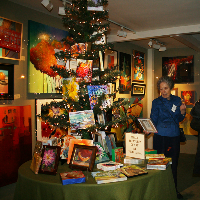 The holiday reception invitation was based on a detail from the painting, Joyeux Noël by one of new member artists, Johane Amirault’s. Her vibrant, (usually) abstract work is a welcome addition to the gallery!