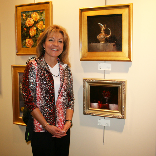 Nancy Cheadle with her paintings Antique Pitcher and Cherries – nancy-cheadle.artistwebsites.com