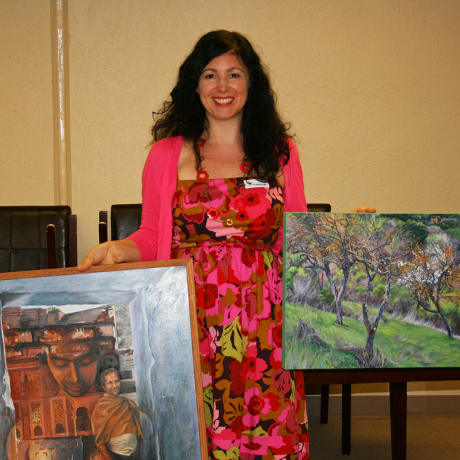 It’s great to take part in the community art scene!  Sunday was one of those unbearably beautiful fall days of bright blue skies and amber-red leaves and I made it to the opening reception of the Los Gatos Art Association Fall 2012 Juried Show at the Addison- Penzak Jewish Community Center with platter full of torrone in hand. Juror John Agg, executive director of the Art Museum of Los Gatos welcomed the rowdy crowd with pronouncements on the fine quality of the art before the awards were announced – my award was that both Imprint and Last Stand had been included in the exhibition in the largest category of oil. I got to meet lots of new faces and see some really outstanding work!