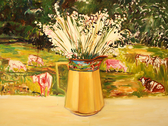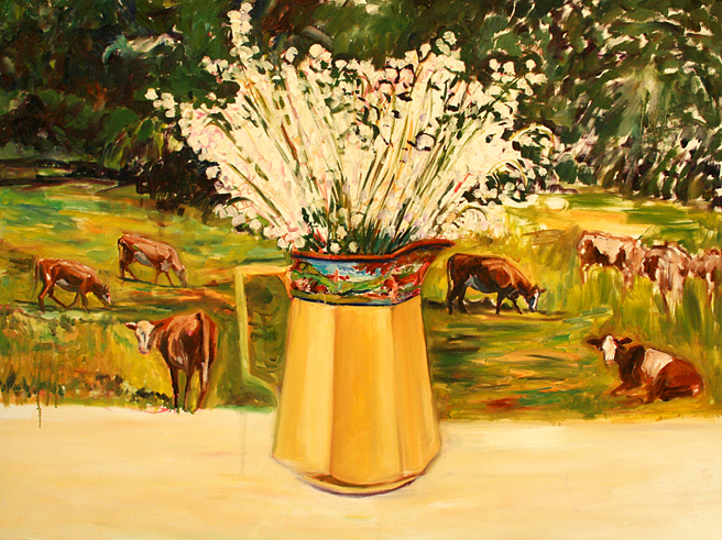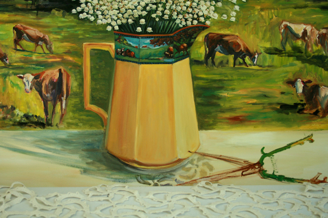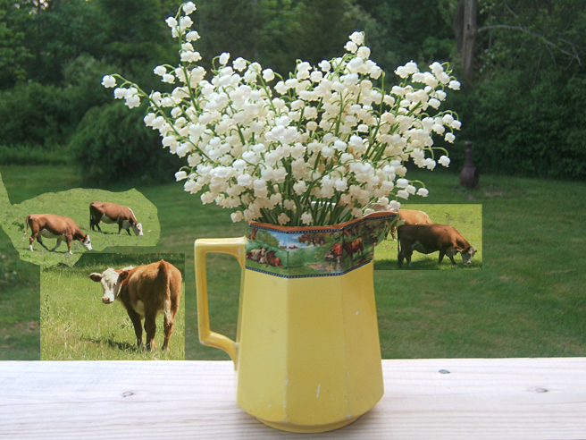 I love the band of cows running around the deco pitcher in which she placed great handfuls of lily of the valley. I thought it would be fun to paint cows in the pasture beyond the pitcher as well, so I went out to Santa Cruz and snapped a bunch of pictures of cows (same kind as Nova Scotian cows) and placed them in the composition.