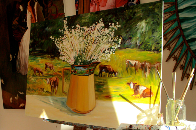 One thing to be careful of when you are working from multiple sources (Christy Ann’s photo of the vase and my photos of cows in the pasture) is that your light source remains unified. I realized that my sources did not match up at all and it seemed easier to modify the lighting on the pitcher and flowers that on the cows. I’ll have to work on that some more tomorrow and try to figure out what I want to do in the foreground. Perhaps I’ll give the suggestion of lace for texture, although part of me wants to put in a big wet nose or furry ear. Suggestions?