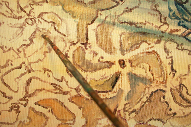 Today I worked on the foreground. I was excited to use the beautiful vintage pinwheel lace that I had picked up at an auction in Nova Scotia years ago as inspiration. It not only complements the lacy feel of the flowers and adds a soft pattern to move the eye around the composition but it is a human web of sorts.