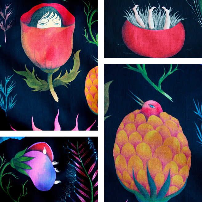 This time it’s a Spanish number by Casita de Wendy. It not only captures some of the joy and mystery of the botanical world (on a flattering black background) but also makes a whimsical, fairylike nod and wink to the work of Hieronymous Bosch and the little hands and feet reaching out of the flowers remind me of the work I’ve been doing with broken doll parts lately.