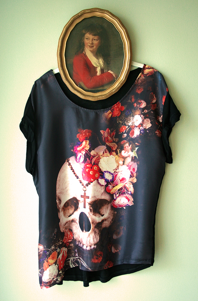 I found the T-shirt at a local thrift store and wondered if I could get away with wearing a giant skull and rosary and decided it was worth a shot. I love how the image is based on the Dutch vanitas tradition which points to our numbered blooming days. Here are some contemporary versions of this theme by what might be an early Dutch master (or a contemporary one), Vanitas by Titti Garelli and Gardenia by Kamei Toru.