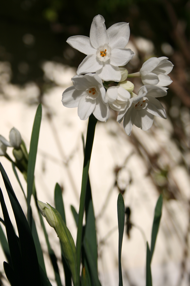 These flowers remind me of Christmas as it was all the rage when I lived in Toronto (especially in the design shops I frequented) to force the bulbs to bloom indoors during our icy winters. Today my narcissus just bloomed on its own in my decidedly un-icy Californian garden!