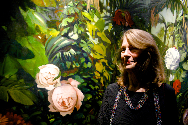 Julie Heffernan’s talk and slide show introduced us to her early art influences that broke through her suburban Ozzie and Harriet style upbringing on the West Coast – passionate Catholic hagiography and hippy hedonism in Golden Gate park, then onto German figural renaissance with her Fullbright scholarship in West Berlin. While in Europe she was exposed to the likes of Velázquez, Fantin-Latour and Bosch to name but a few and so began her lush still lifes as self portraits, traditional still lifes with contemporary flourishes and mind bubbles. These grew into the monumental, surreal follies, and the epic dystpoias of today which have been fueled by both personal and global events.