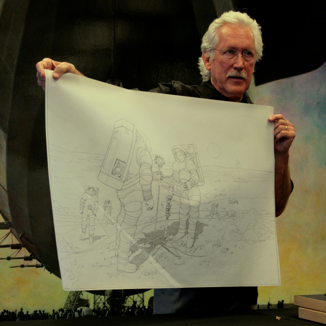 Rick Guidice unscrolling one of his early drawings of Mars space suits that had been modeled for him at NASA Ames Research Center.