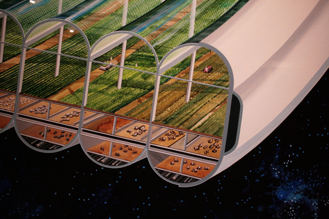 Here’s a detail of agriculture in space, from a Rick Guidice painting. Maybe this is where The Muppets “Pigs in Space” concept came from?