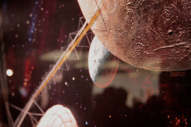 In Mass Driver with Solar Power Station, an acrylic painting from 1977, Guidice explained how he chose to paint it from an unusual perspective – one where the earth was floating above instead of under our feet. He even signed it to make sure the orientation was maintained in future publications but to no avail, we earthlings are so fixed in our imagination, it was often printed upside-down.