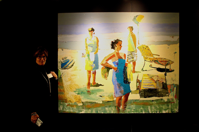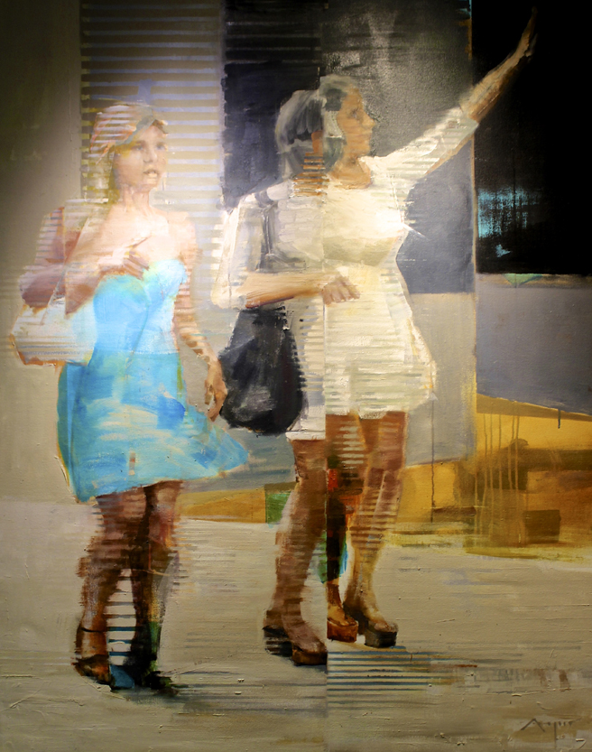 The paintings go through radical transformations as she works, which she demonstrated to us in a series of photographs. She may lay in the loose outline of a figure in a scene then go back into it with stencils and palette knives and brushes, breaking up the figure and space in surprising ways which direct the painting until there is an emotional resonance that starts to happen.