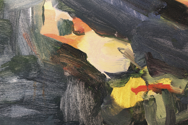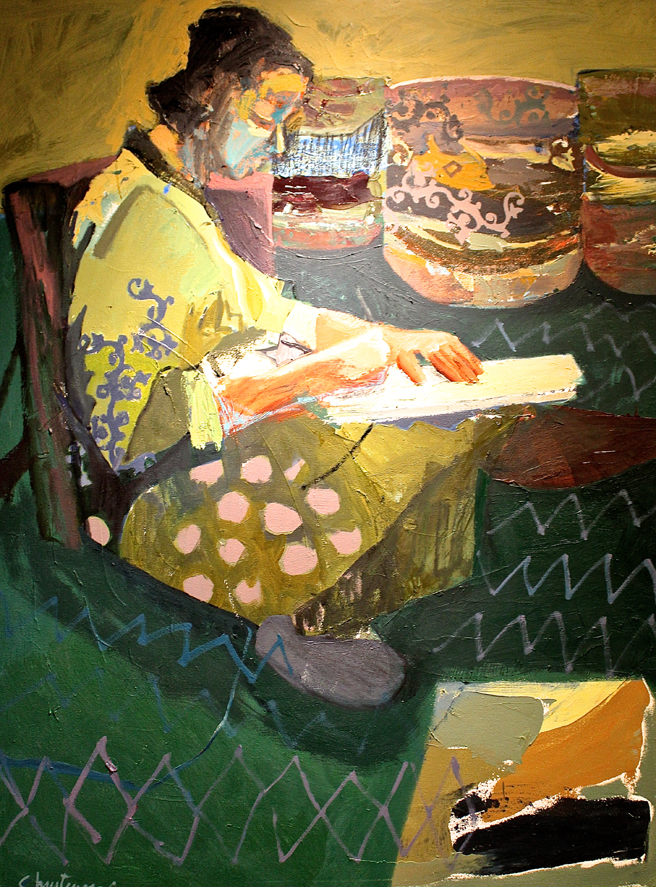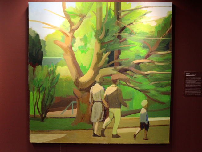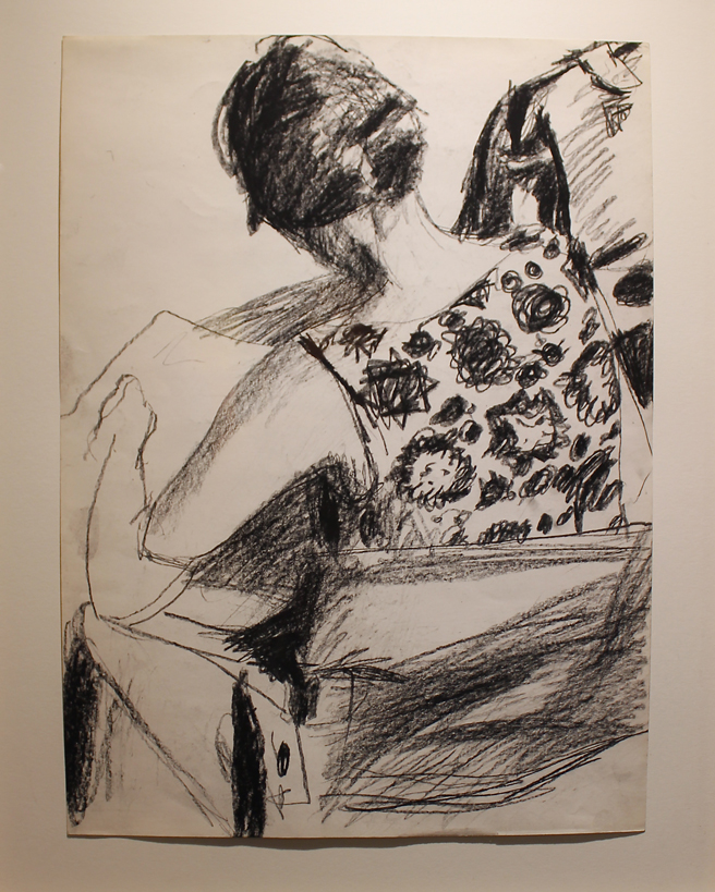 In Self, Linda Christensen’s oil painting in the More that your Selfie exhibit at NUMU, as in most of her work, the artist is interested in the “honest body language of the unobserved figure”. Her paintings are not about capturing a likeness but rather a gesture, a pose and in inner life. Her paintings are large and loose and bold and laced the line and pattern.