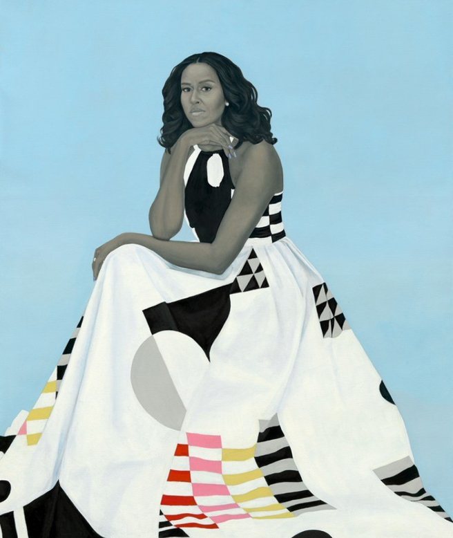 Amy Sherald’s heavily stylized portrait of Michelle Obama exemplifies her work. Her subjects are presented in a greyscale wearing colorful, often patterned clothing and set against a simple, colored backdrop, which carefully isolates the direct gaze of the subject. Traditionally, classic oil paintings begin with a grisaille underpainting, in shades of grey to better control values in achieving a three dimensional effect before adding transparent washes of color. At one point Sherald decided she preferred the contrast of the grey skin against the colored backdrop and outfits. Perhaps it was simply an aesthetic choice, perhaps it came out of the agency that early photography brought to African Americans in how they chose to portray themselves that resonated with her. The dress that Michelle Obama is wearing, by American designer, Michelle Smith of Milly, is in keeping with the subject’s support of American designers, the within-reach, if somewhat aspirational couture she chose as First Lady but more importantly, this dress contains references to the Gee’s Bend quilts, designs passed down from generations of African American women, some of which encoded Underground Railway information – all while still feeling fresh and modern and as elevated as a Mondrian!