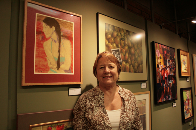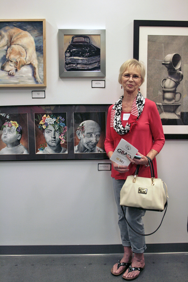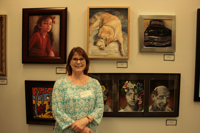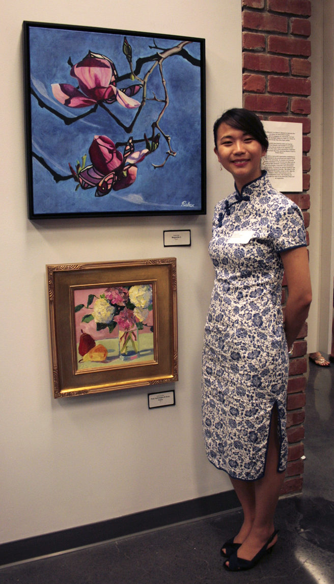 Rebex Nie with her acrylic Magnolias II, Kerrie Brandau with her oil, George and Joan Drennan with her oil, Cherry Chevy.