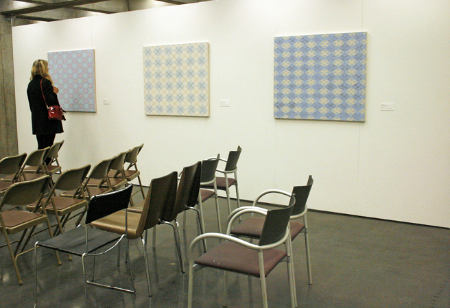 In this “argyle” series on muslin, the color of paint is influenced by the unprimed muslin itself which is left to show through in areas.