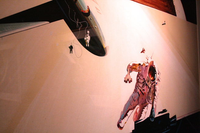 Astronauts tethered to an early space shuttle in a detail from a Guidice painting.