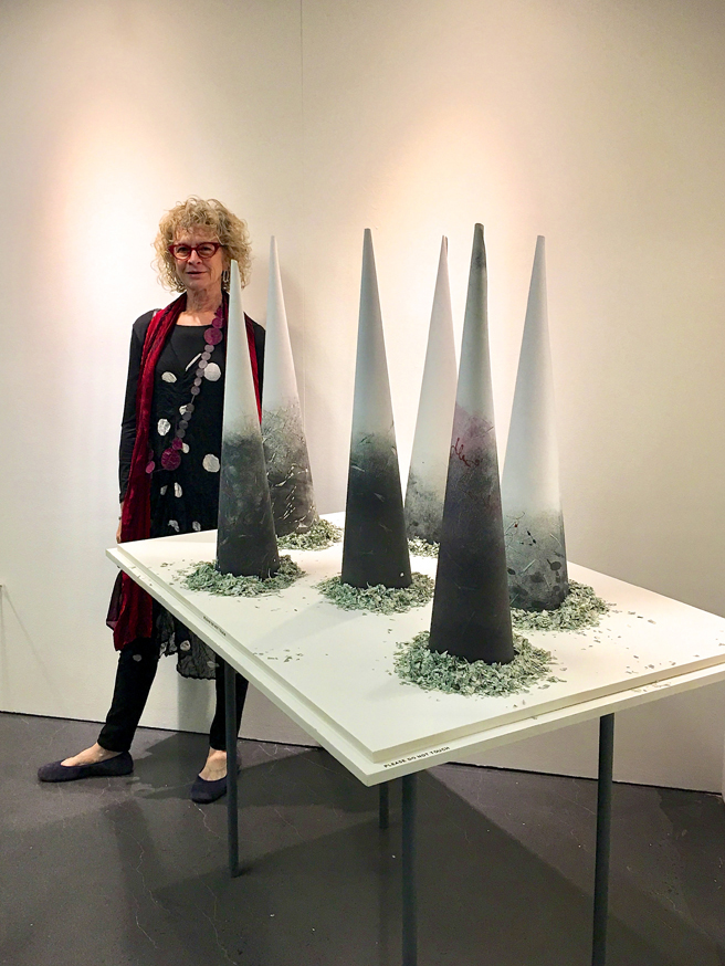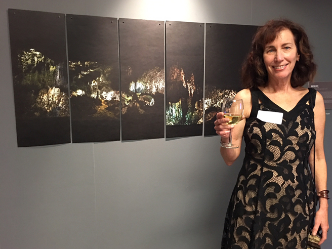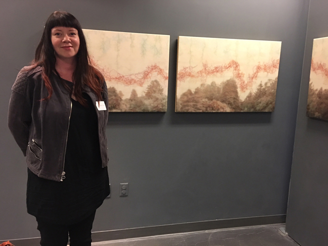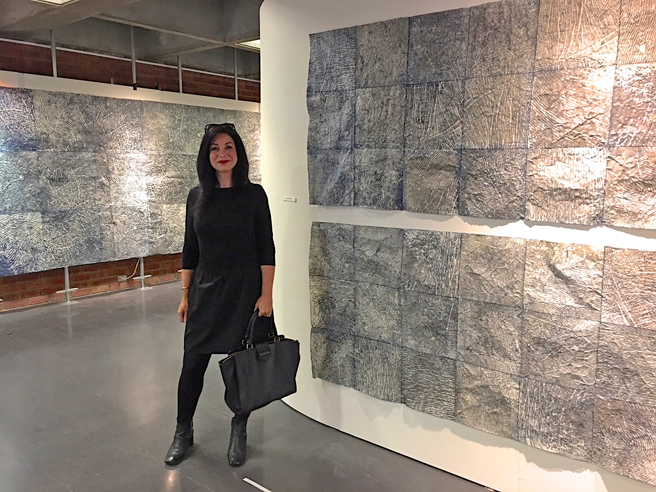 Linda Gass with her sumptuous painted silk textile pieces, Owens River Diversion and San Joaquin Merced Revival.