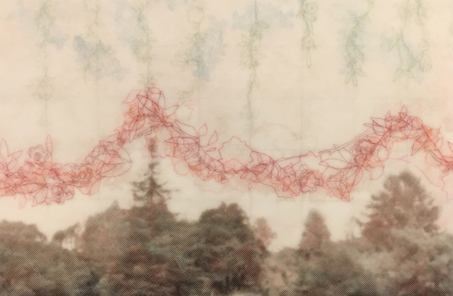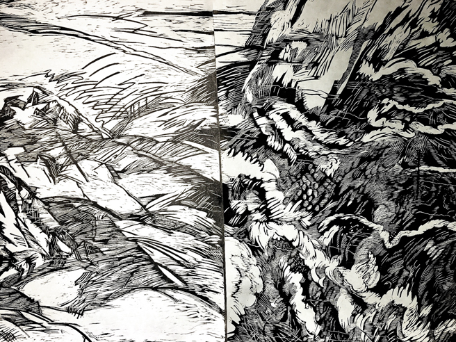 Robynn Smith – Liminal Terrain – 2015 – Linoleum relief print over digital output, 5 panels. This artist will be offering a Silk-Cut Linoleum Relief Printing Workshop July 14 & 15 at the museum.