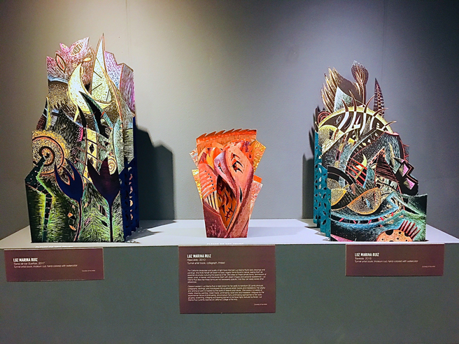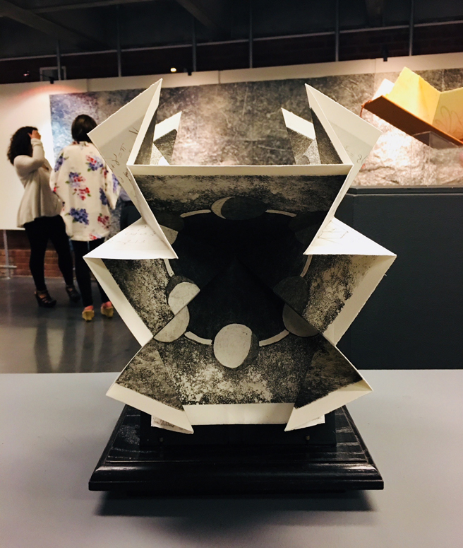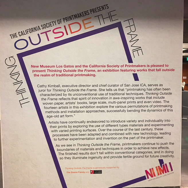 I was excited to take in the new print show which opened to members last Thursday night at the New Museum Los Gatos! Presented by The California Society of Printmakers, Thinking Outside the Box was juried by Cathy Kimball, Executive Director and Chief Curator of The San Jose Institute of Contemporary Art, bringing together fascinating prints, which employed a wide variety of processes, mediums, materials and methods of presentation, engaging the viewer in a very different experience than with traditional printmaking. Makes me want to print on stuff!!! The show runs until September 30. Check the NUMU website for hours and all the printmaking demos they have lined up this summer! Also, click on artist’s names below for links to their wonderful websites if you’d like to see more of their work.