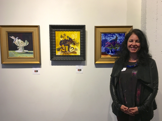 Me with three of my Birds & Teacup paintings, Tea II, Petunia Tea I and Anemone Tea I.