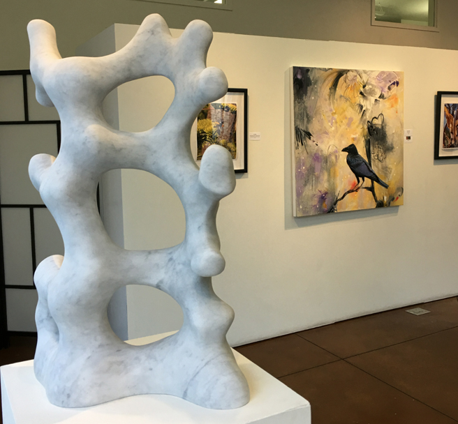 Oleg Lobykin‘s Sea Foam sculpture and a crow painting by Janey Fritsche.