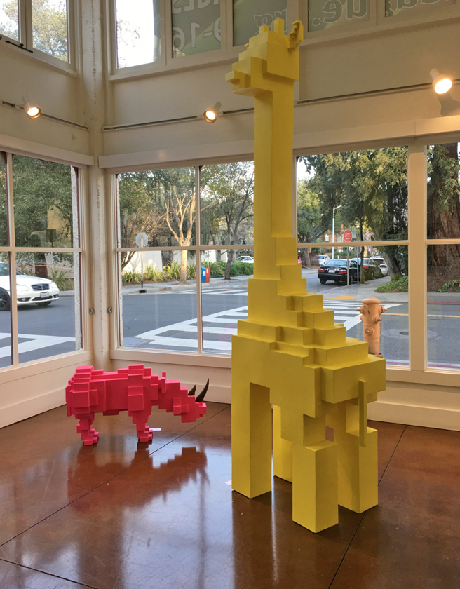 Jihoon Choi with his painted steel Pink Rhino and Yellow Giraffe.