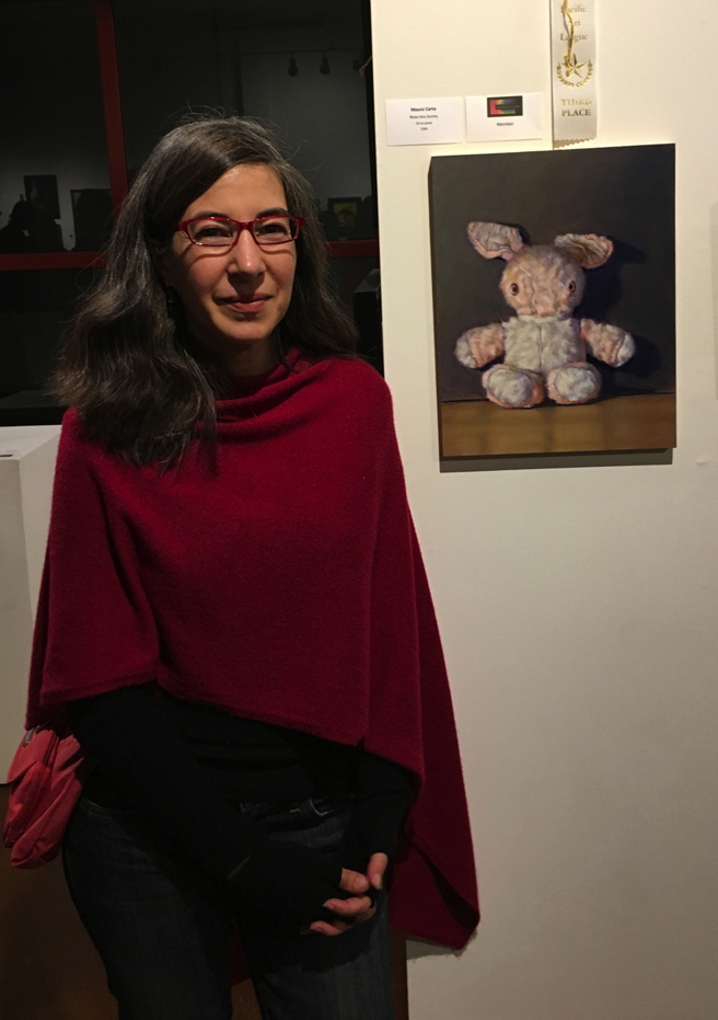 Third Place was given to Maura Carta‘s oil on panel, Nose-less Bunny.