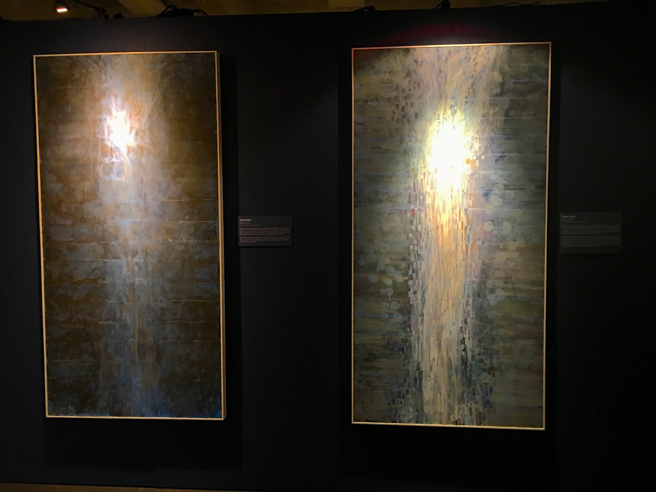 Christel Dillbohner with Frozen in Time – oil, cold wax on linen and Motionless Torrents – oil on silver leaf.