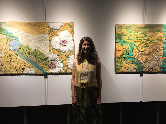 Linda Gass with her sumptuous painted silk textile pieces, Owens River Diversion and San Joaquin Merced Revival.