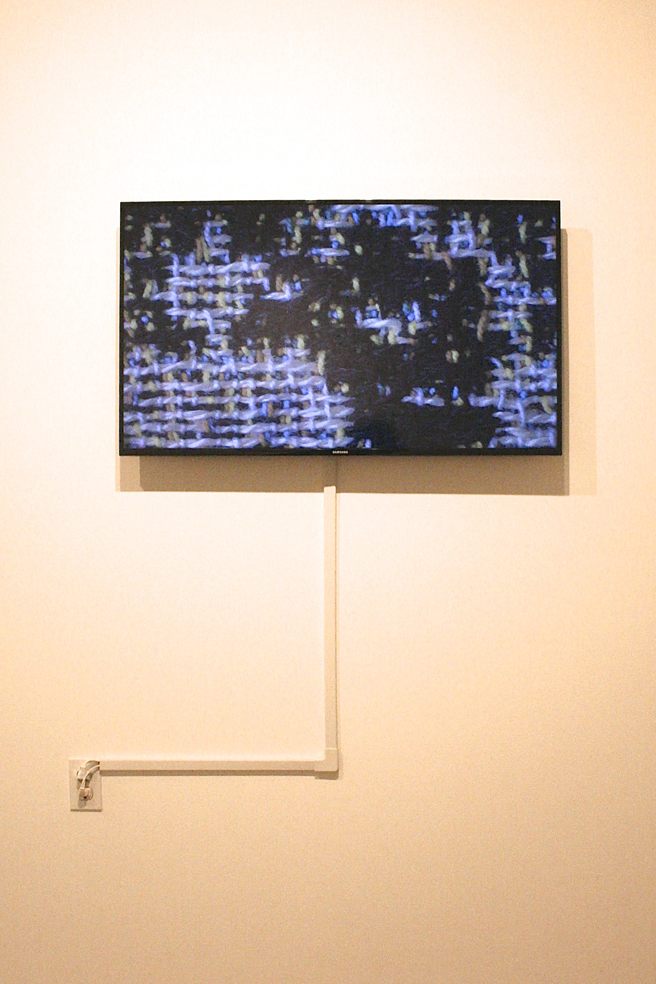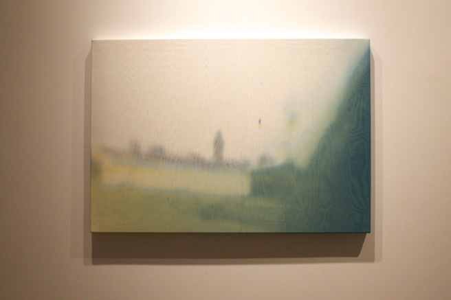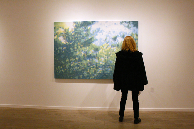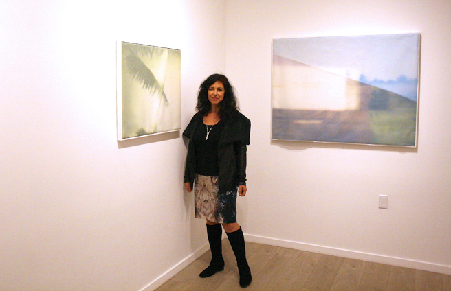 The Landscape in Us, a collaboration by Cichon and Toivo are photographs, a Finnish forrest printed on fabric and a video projection of a California seascape video on an overlay of organza, melding two landscapes representative to each of these artists.