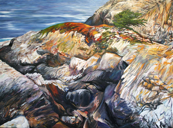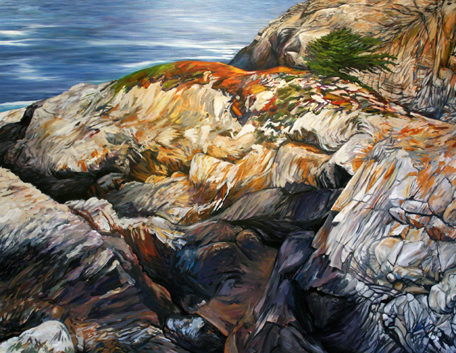 I hope to capture the precarious nature of life on the margins of land and sea in this painting I began last Friday. I’m using one of the many photographs I took in the summer of the cypresses in Point Lobos as inspiration. It’s just so stunning to see these lone trees clinging to sheer rock face, pummeled by the Pacific! I like how the tree is dwarfed by the massive outcropping of rock on which it clings, rock which has been stripped nearly bare by the ocean. It’s almost a portrait of a landscape in which the skin and muscle has been pulled away to reveal the skeletal structure. Although the cypress symbolizes death and mourning, here I think it is a metaphor for perseverance.