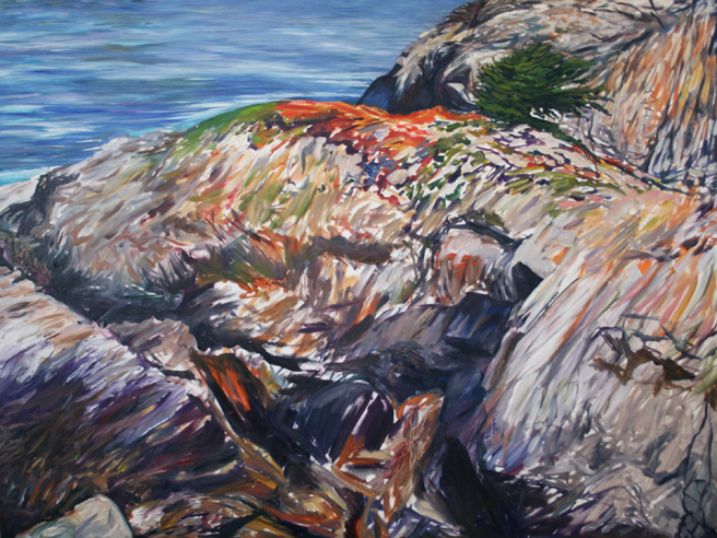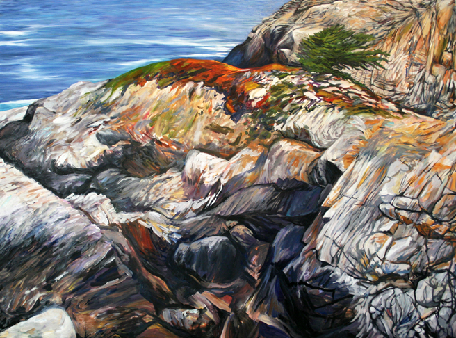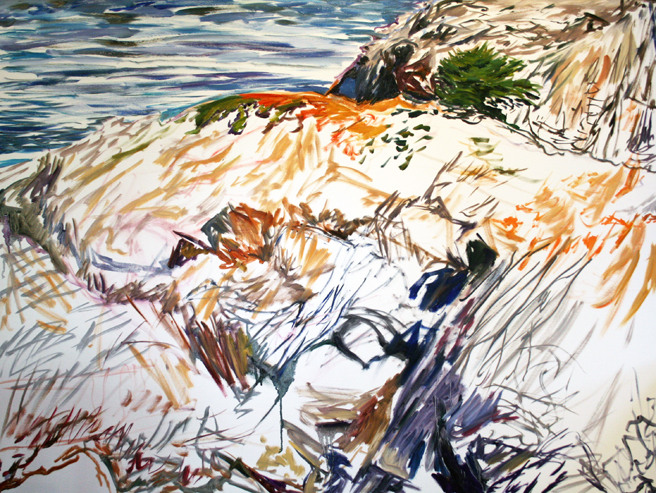 Here I am working on another vista from Point Lobos. In this one I’m interested in the crescent shape that is formed in the corner in the upper right, it seems a welcome contrast to all the lines and angles, much like the contrast between the vegetation and the stone. I really enjoy how the swath of blue ocean seems to bleed down the rest of the painting.