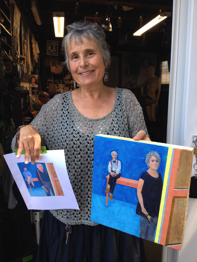 I go t to meet and talk shop with encaustic artist, Linda Benenati. Here she is with a recent self-portrait after David Hockney.