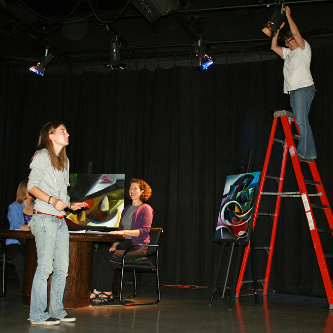 I’m normally in bed soon after the sun sets but I made a special exception last night. I’m being considered for a guest spot on SV Talk Art and the director, Nance Wheeler had asked me to come in to their Mid Peninsula Media Center studio to learn the ropes while they taped an episode. I got to be a colorful fly on the wall as the crew set the lights, cameras and microphones for host Sally Rayn to interview artist Judy Gittelsohn. I had no idea how much was involved in getting everything ready to go! All the lights are angled and tinted, the paintings tilted and adjusted, all the cords plugged in and equipment checked to see if it’s working properly. Testing, testing testing! I must remember to wear something cool under all those hot lights or I will be running like a watercolor wash! These broadcasts are designed to provide insight into the art and artists that participate in the Silicon Valley Open Studios. I took part in SVOS last spring, and it was such a magical event I can’t wait to do it all over again this year! You can find SV Talk Art on You Tube, information on Silicon Valley Open Studios at svos.org and more about Judy at artforwellbeings.org.