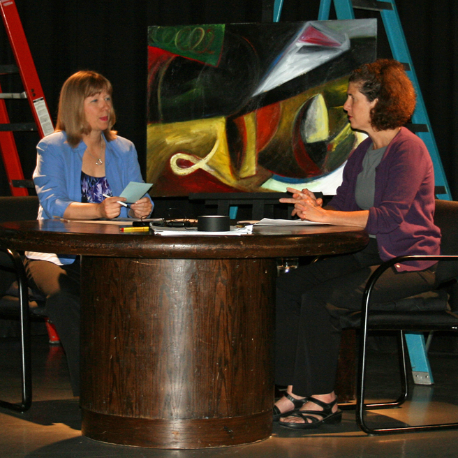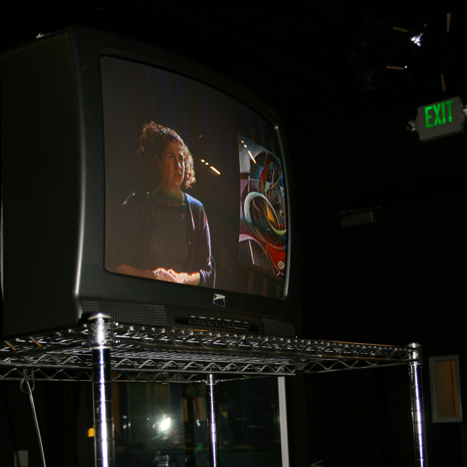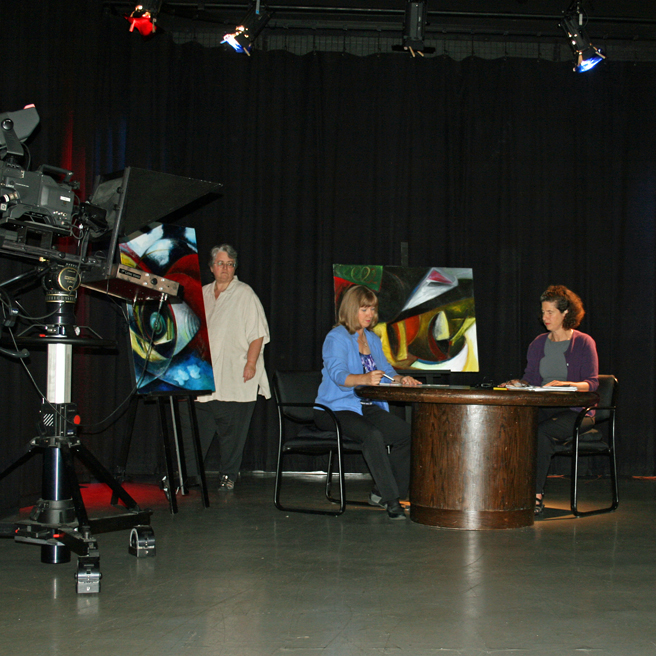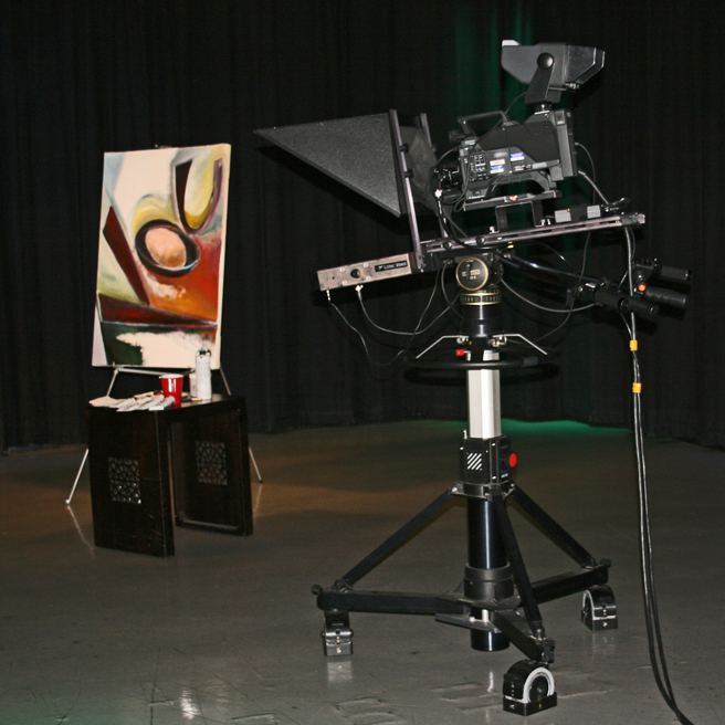There is a monitor in the studio where the guest artist, Judy Gittelsohn, can comment on her paintings as they are shown on screen while taping.