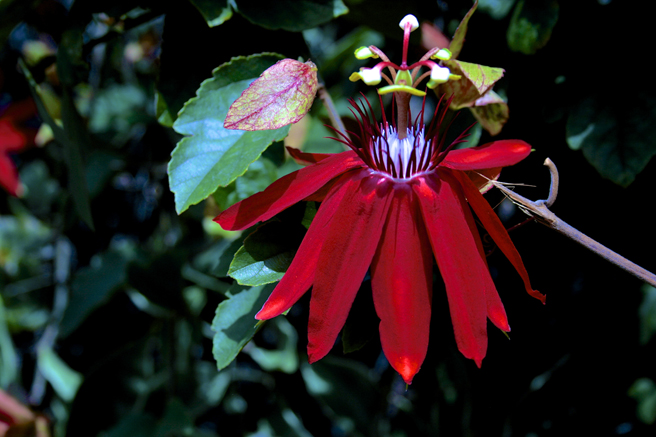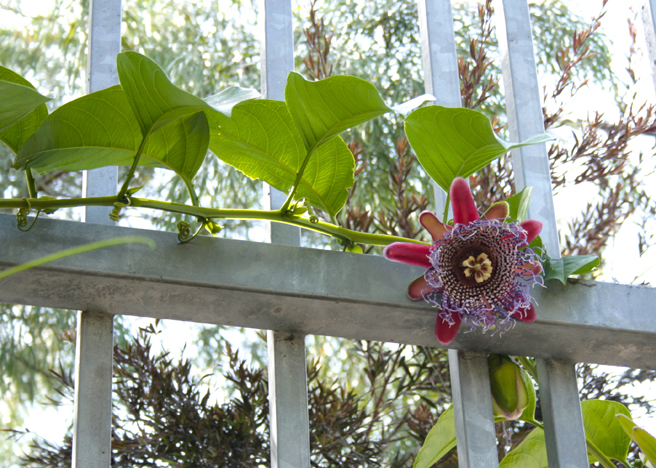 Wall covered with these red passion flowers.