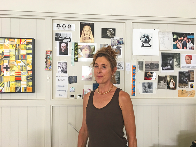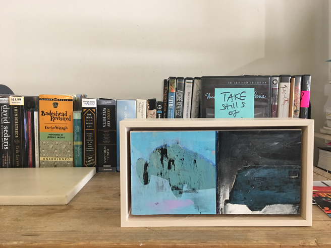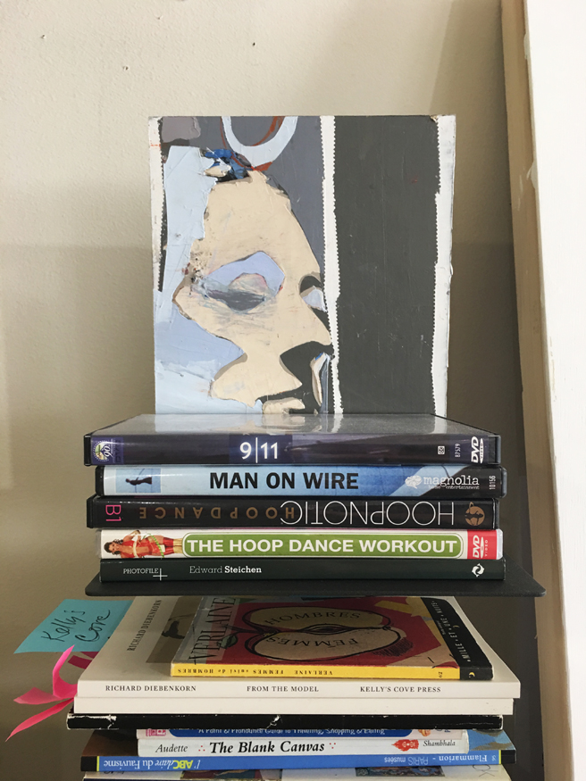 Self-portrait on a stack of books. You can learn so much about an artist from her studio. Kim’s is full of interesting books and photos and quotes (and a few wigs and hula hoops).