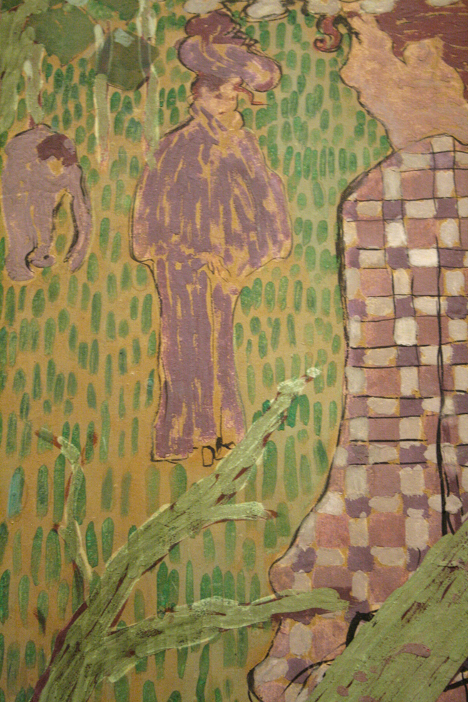 You can clearly see the decorative stylized elements in his early pieces, Woman in Dress with White Dots, Seated Woman with Cat, Woman in Cape, Woman in Checkered Dress 1890-91. Close up you can see the simple laying in of paint stokes over the tan substrate.