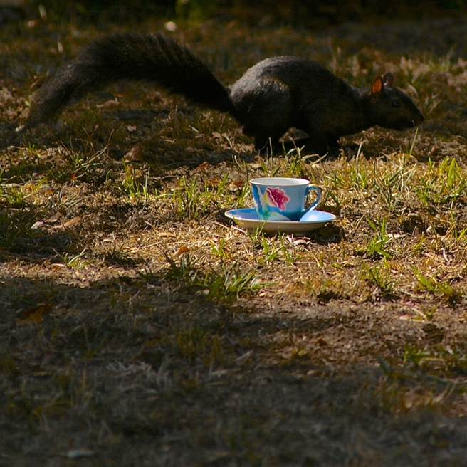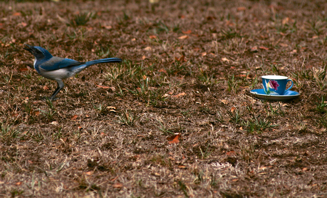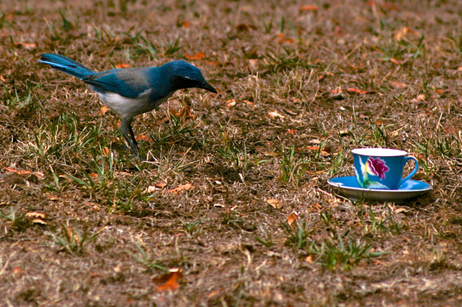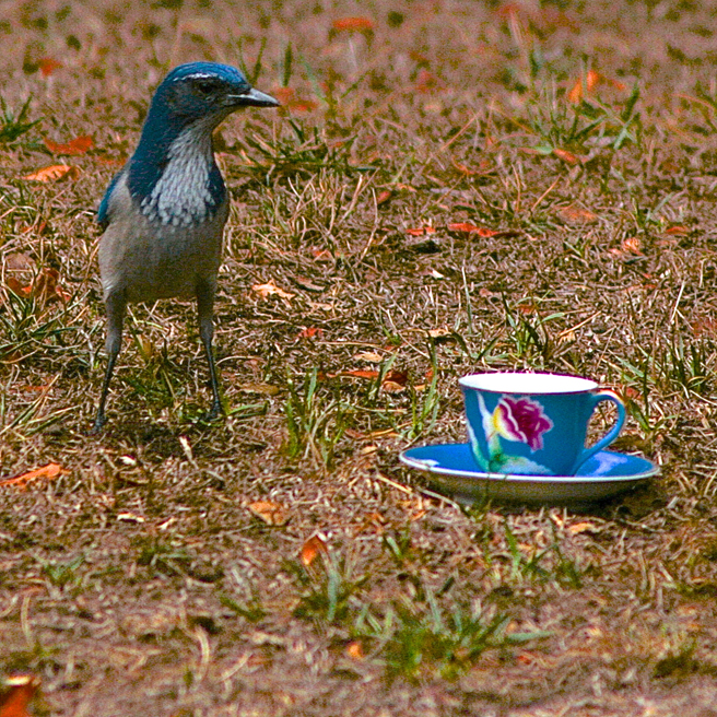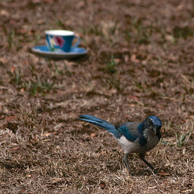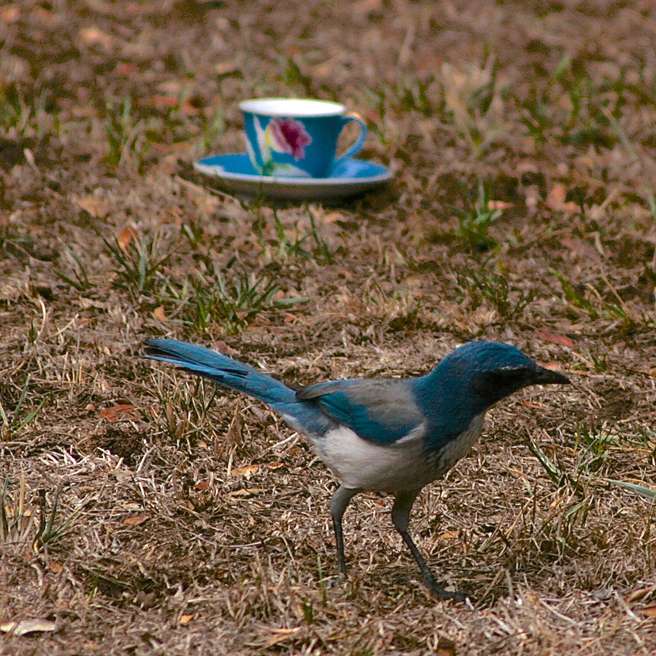 But yesterday was something new…a scrub jay was busy caching acorns about my yard and I thought it would be a great opportunity to get a shot of the bird with the actual teacup I had planned on pairing it with. Usually I try to scale the bird to the teacup with the measurements listed on birding sites but this was going to give me a real life comparison, if only I could get them in the same shot! I filled the teacup with birdseed and acorns and retreated to my studio stoop with my telephoto lens on my camera. I had only a few minutes to wait before there was some interest…