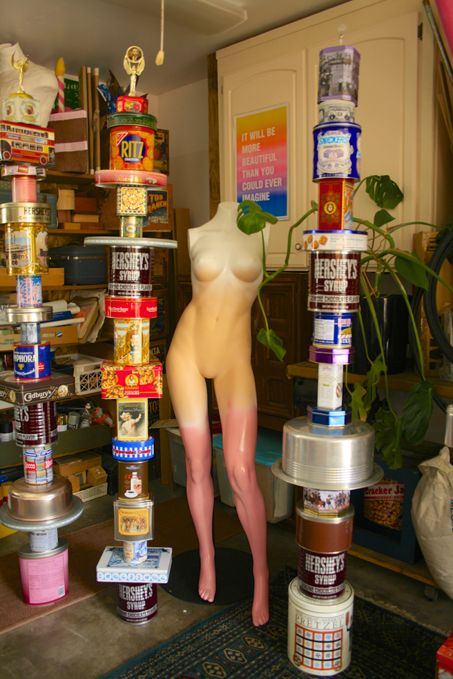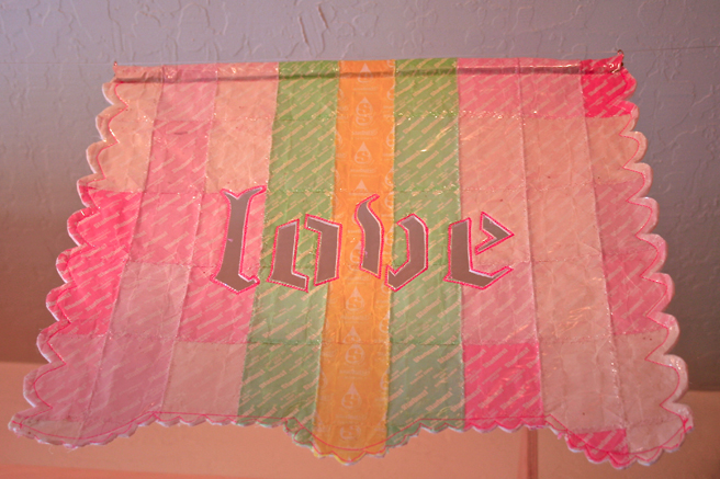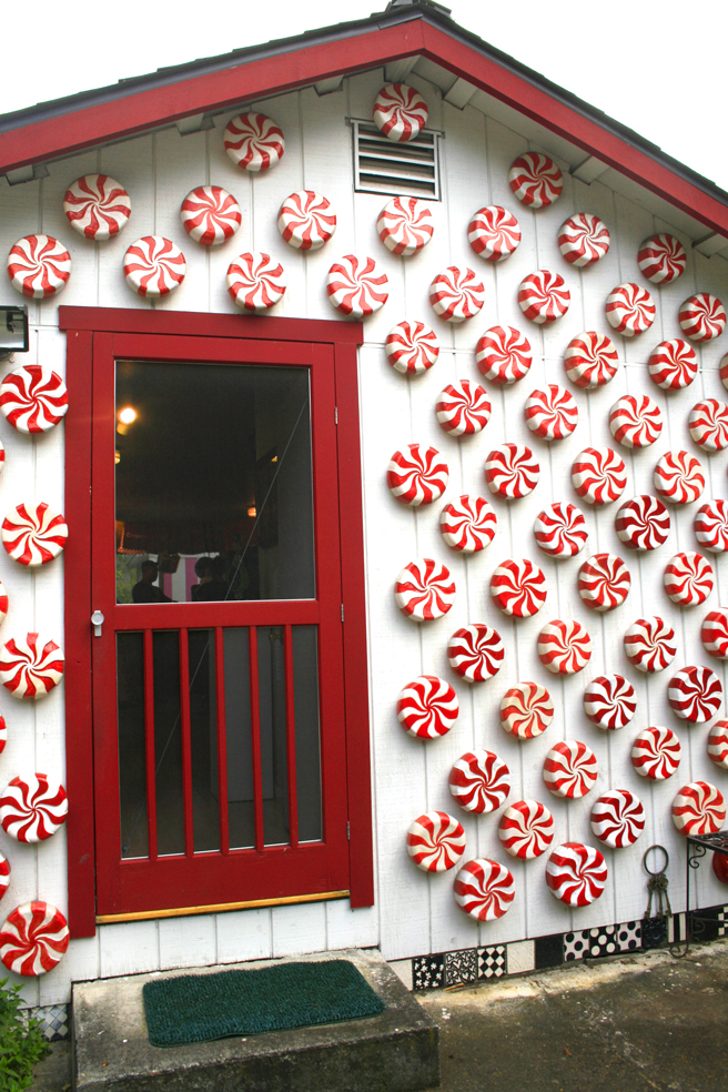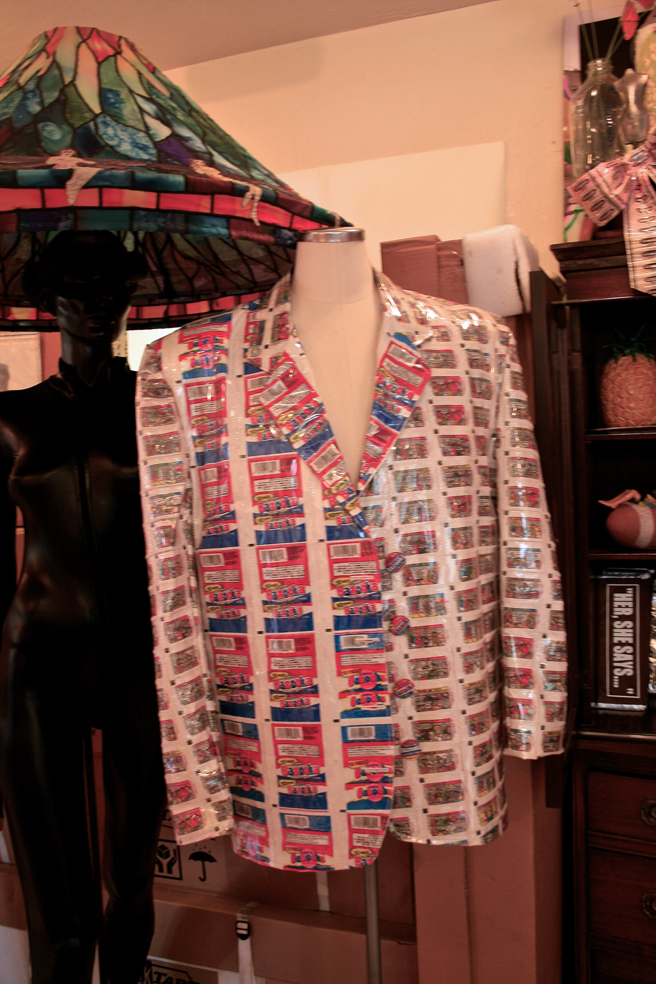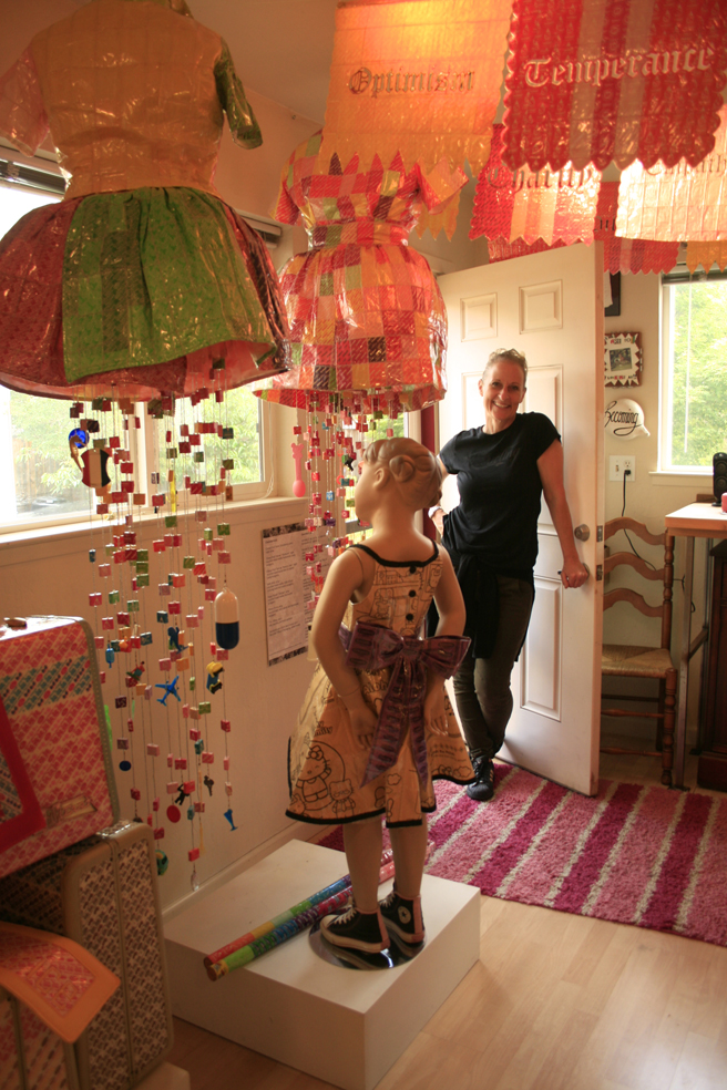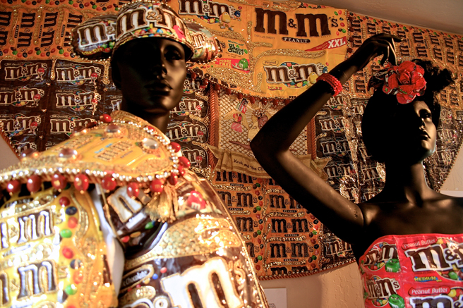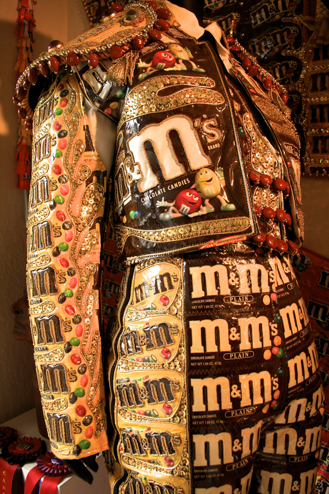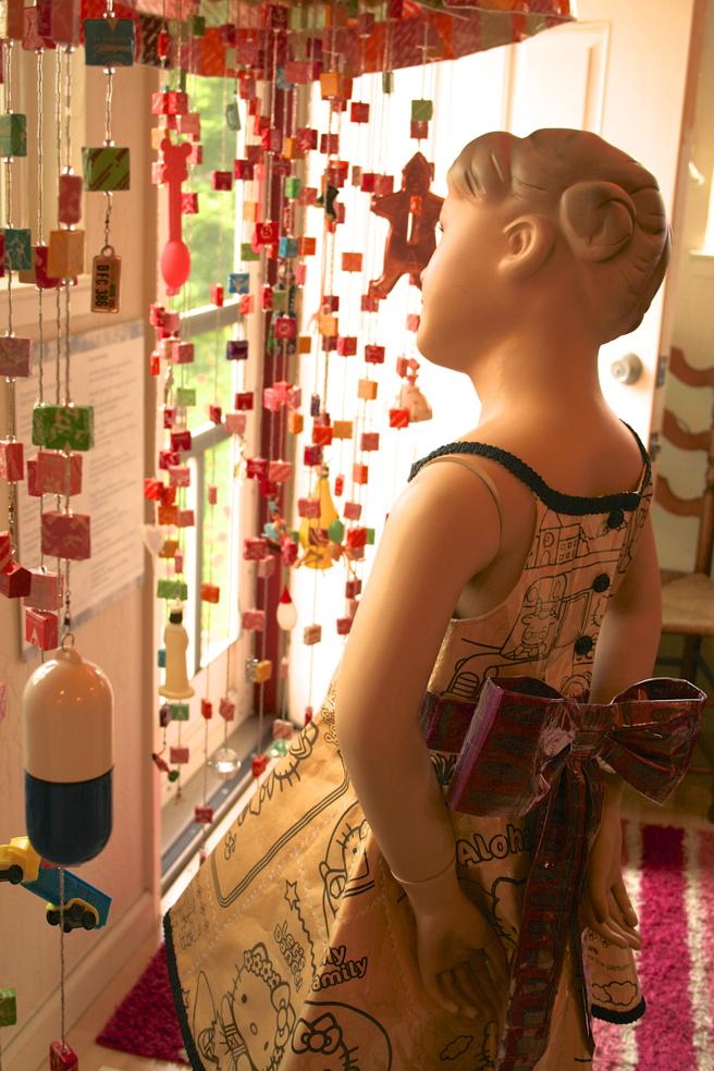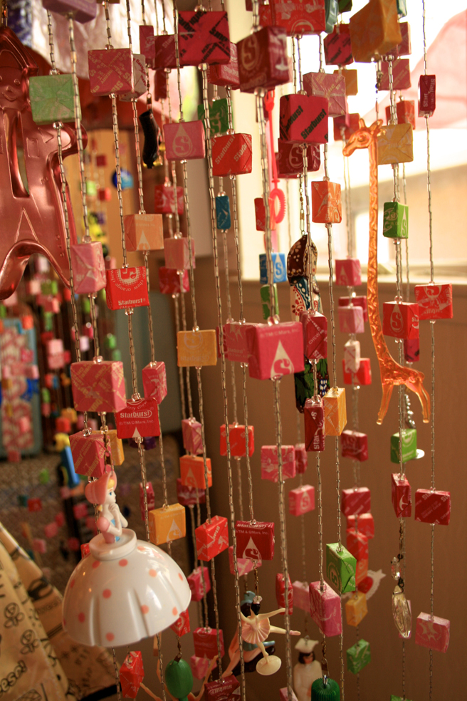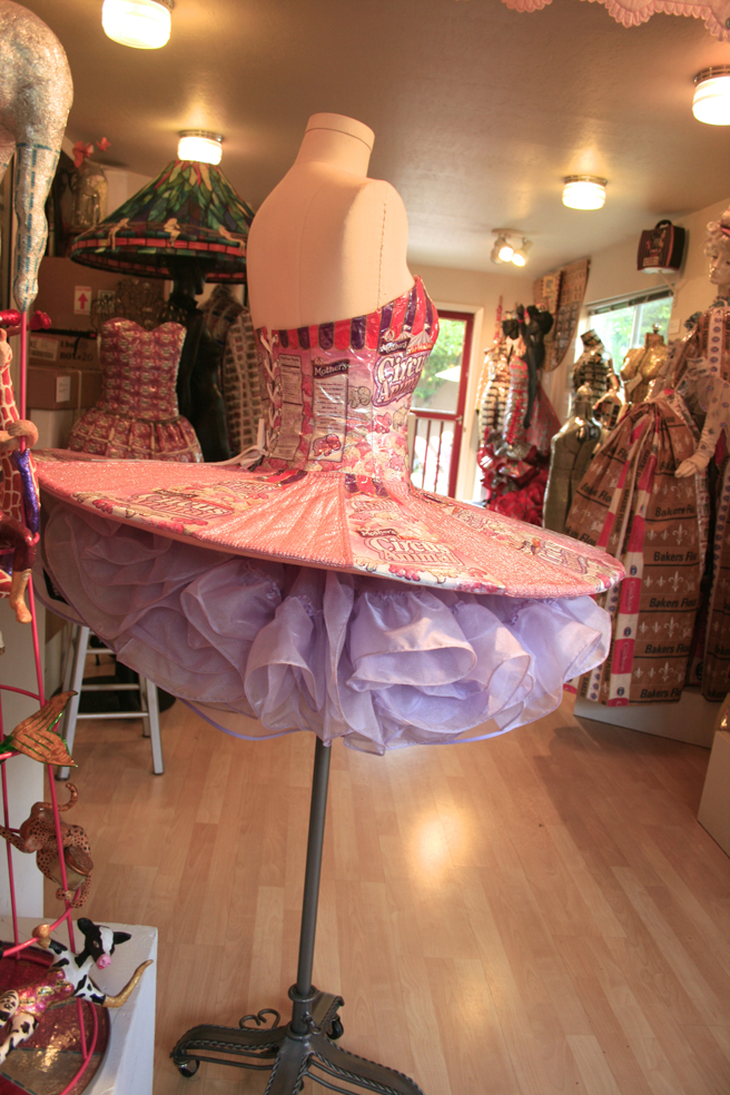 I finally got to meet Charlotte Kruk, at her open studio last weekend! I first saw her work through Image magazine (the M&M Toreador and Flamenco Dancer couture) and then I saw Let Them Bake Cake (the Marie Antoinette inspired convection made of sugar and flour bags and all the cake making ingredient trappings) at the Triton Museum of Art. I’m such a big fan of her fun and fabulous wearable art made from colorful candy wrappers and the like – it’s full of joy and playfulness!